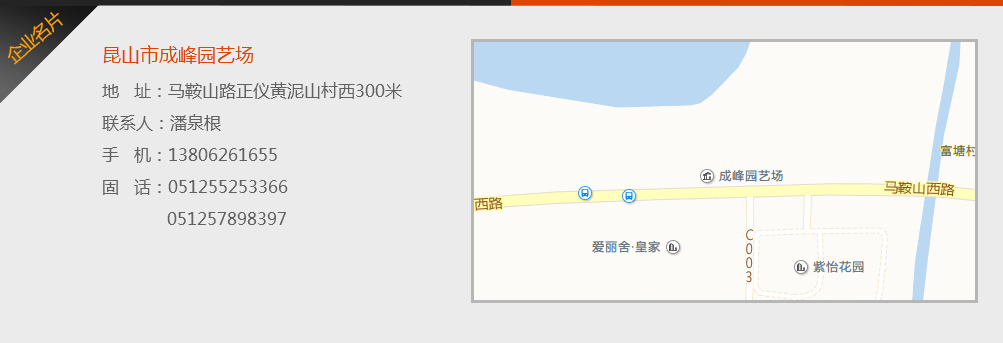 昆山市成峰园艺场处于江苏省昆山市马鞍山路正仪黄泥山村西300米,公司是一个集环境、绿化、园林景观设计、施工、花卉、观叶植物租摆、园林资材为一体的大型实体性公司。